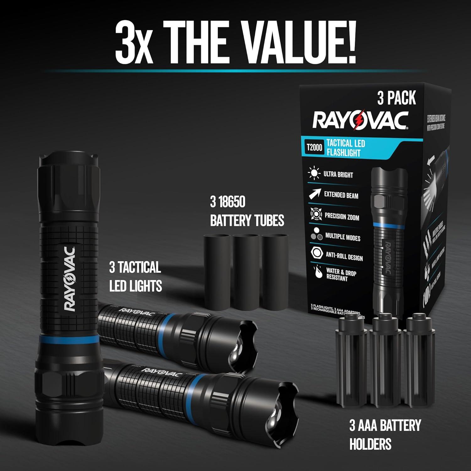 ONE 3-PACK OF RAYOVAC T2000 TACTICAL LED FLASHLIGHTS: Conveniently small flashlights that offer powerful brightness in a compact yet durable form factor