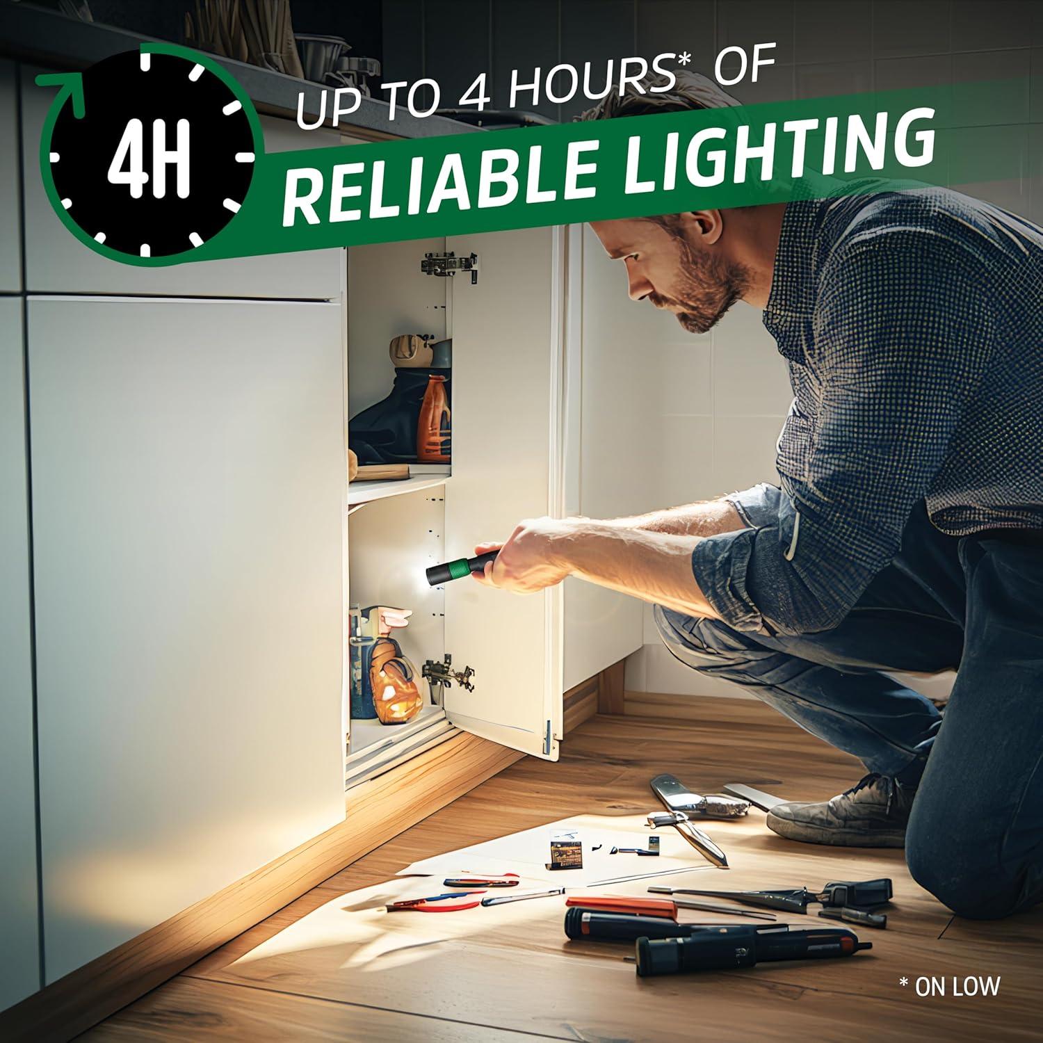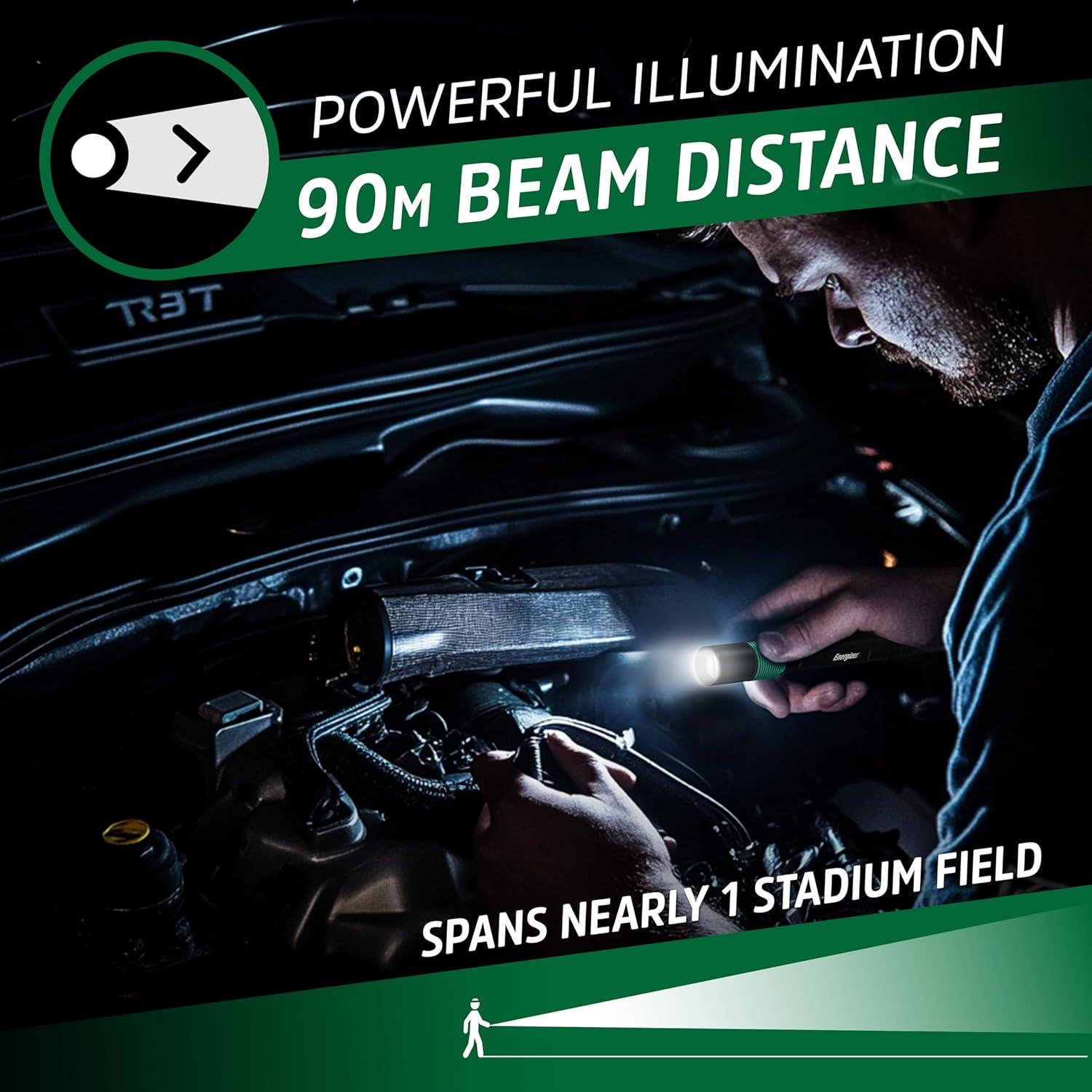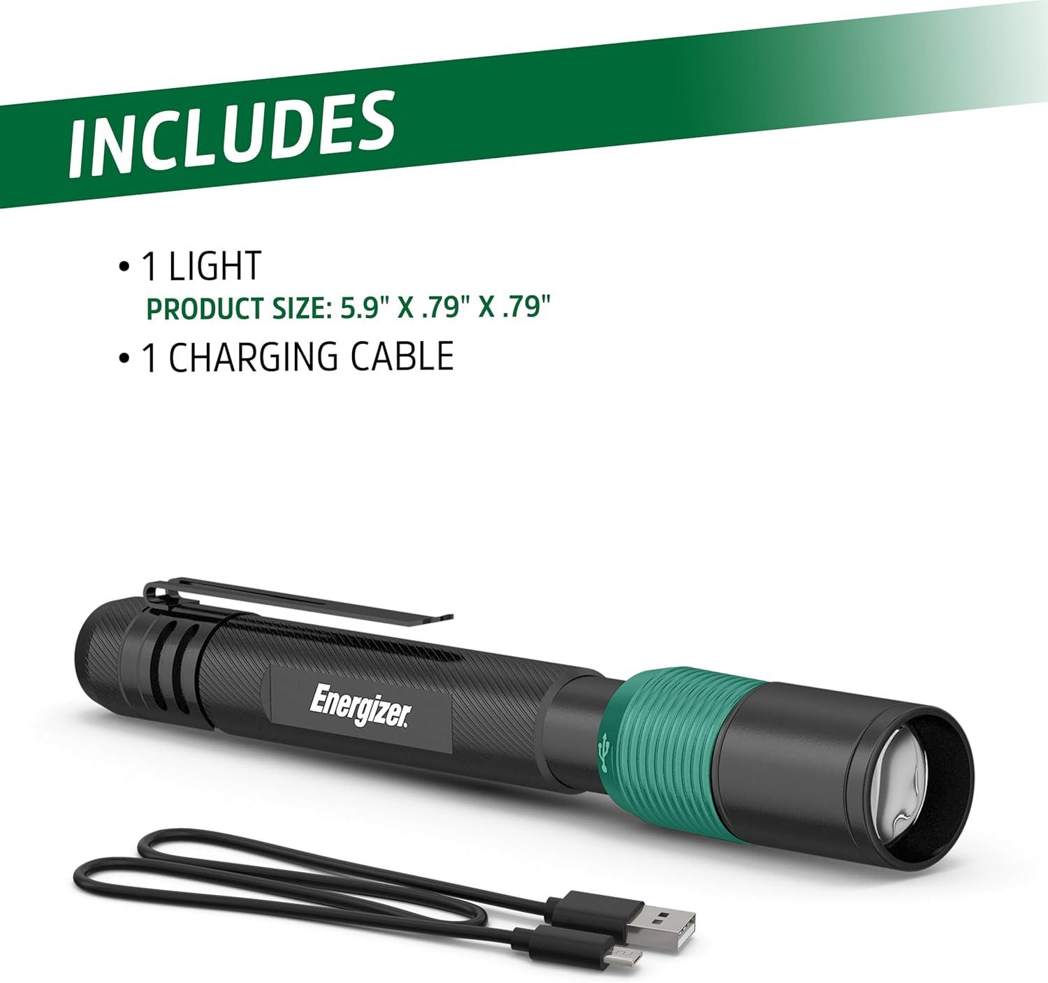 Shine a bright light when you're up close with the Energizer Rechargeable Penlight. This compact flashlight emits a powerful beam and is small enough to slip in your pocket. Casting off 400 lumens on High mode, the directional LED work light is particularly handy when you need bright, close-up light, whether you're reading in the dark or checking equipment during a power outage. Recharge this portable light again and again—the non-removable lithium ion battery delivers long-lasting performance. This tough metal flashlight features a tail switch for easy use and a metal clip that secures the rechargeable flashlight to your pocket or tool bag. A micro-USB charging cable comes included. Trust in Energizer for reliable performance in any situation.